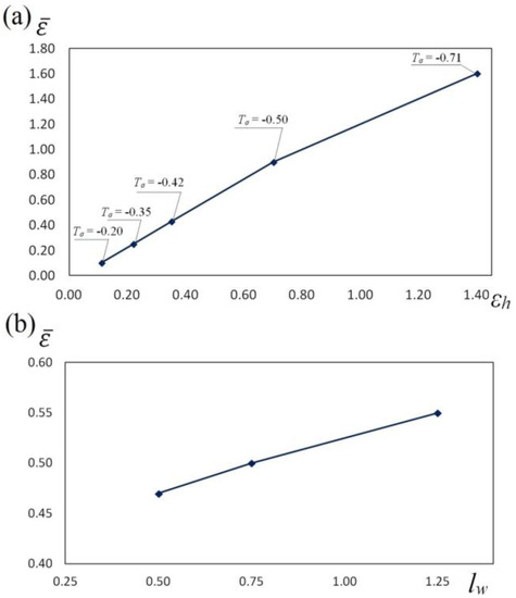 In Figure 10, the distribution of effective strain after the second pass in the case of forging the samples of the X32CrMoV12-28 die steel in anvils with skew working surfaces with a changeable value of feed rate are presented. The area with the highest values of effective strain included a significant part of the axial zone of deformation, whereas an increase in the values of feed rate from lw = 0.75 up to lw = 1.20 brought about an increase in effective strain from = 0.89 to = 1.05.