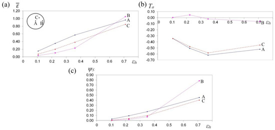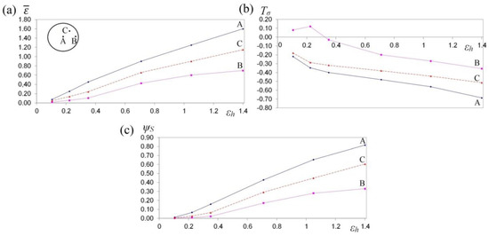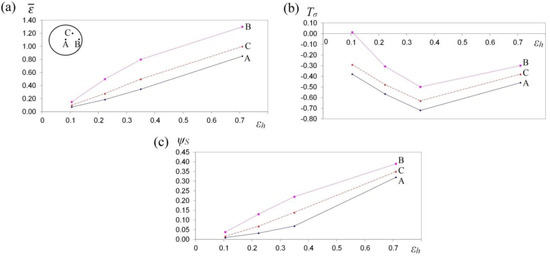 A two-fold increase in reduction ratio (εh = 0.70) brought about an intensive increase in the values of the deformation damage factor, ΨS = 0.30–0.35, in the particular zones of plastic deformation represented by points A, B and C, whereas the character of these changes for particular investigated anvils was similar to the results obtained after the first technological pass (εh = 0.35). A further increase in the total reduction ratio up to the value of εh = 1.40 (after the fourth technological pass) in the course of forging in anvils with skew working surfaces brought about a proportional increase in the deformation damage factor at particular points of the cross-section (Figure 15c). Nevertheless, reaching the threshold value of the deformation damage factor and the formation of discontinuities in the course of forging in anvils with skew working surfaces originated significantly later for the higher values of reduction ratio. The possibility of prediction of the ductile fracture of a shaped material during the cogging process is an indispensable element of designing the best possible technological process.