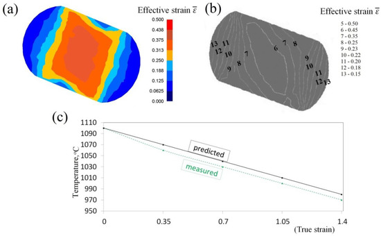 Comparison of theoretical and experimental results after the cogging process in anvils with skew working surfaces: theoretical (a) and experimental (b) distributions of effective strain (lw = 0.75, εh = 0.35); (c) temperature on the surface of the specimens.
