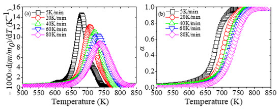 Table 2 shows that by comparing References [12,24], there will be a difference in Ea. There are many factors that affect the calculated values of kinetics, such as raw material source, heating rates, temperature, gas flow and so on [51,52]. Jiang et al. [12] selected four heating rates (5 °C/min, 10 °C/min, 15 °C/min and 20 °C/min) and conducted the thermogravimetric analysis with a gas flow of 20 mL/min in nitrogen. Furthermore, the sample weighed about 6 mg, and it was cut to powder and heated up to 800 °C. In the test of Jiao et al. [24], 4 mg particulate sample was heated to 700 °C with four heating rates (5 K/min, 10 K/min, 20 K/min and 30 K/min), and the flow rate of nitrogen was 75 mL/min. In this study, the 6 mg powdered sample was tested at heating rates (5 K/min, 20 K/min, 40 K/min, 60 K/min and 80 K/min), and the temperature was 300–1000 K, and the flow rate of nitrogen was 100 mL/min. It is noted that the calculated values of the literature are only used to compare with calculated results of this study, and they are not the boundaries of the range.