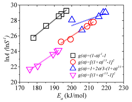 To establish a suitable reaction mechanism, “kinetic compensation effects (KCE)” is generally accepted [56]. If the model is proper, good linear relation occurs between Ea and ln A, as expressed in Equation (25).