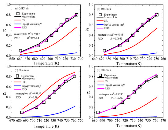 There are many methods to obtain the kinetic model of solid state. To obtain a more accurate analysis, it is necessary to compare multiple kinetic methods. As shown in Figure 4, the α of CR, the iterative procedure, masterplots and PSO methods is compared with the experimental value in the cases of 20, 40, 60 and 80 K/min.