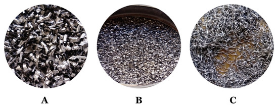 The swarfs from machining, i.e., alloys Inconel 625 (I625), Inconel 718 (I718), and Titanium Grade 5 (TG5), were received from the automobile company (Poznań, Great Poland, Poland). During the investigations, materials were used in the form received from the vehicle component manufacturer. In addition, the obtained materials had different sizes and forms including thickness and width (from less than 1.6 mm to more than 6.3 mm). Furthermore, the materials were covered with unknown oily substances derived from metalworking fluids.