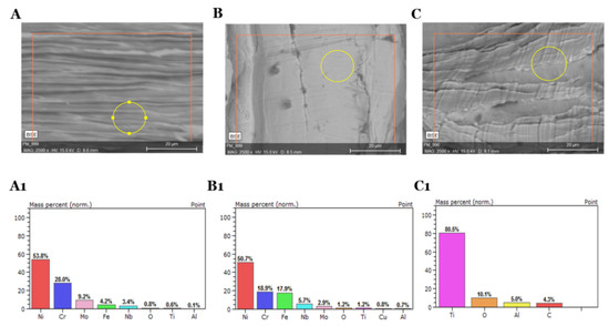 SEM-EDS photos after oil removal from Inconel 625 (A,A1), Inconel 718 (B,B1), Titanium Grade 5 (C,C1) swarfs in a thermal process (900 °C) with the elemental composition of the surfaces.