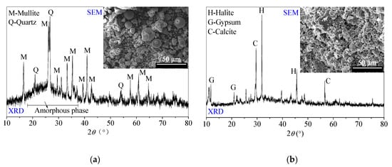 Scanning electron microscopy (SEM) photos and X-ray diffraction (XRD) patterns of (a) low-calcium fly ash (FFA) and (b) soda residue (SR) [24].