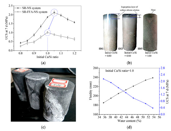 The fluidity and 7 d UCS results for the SR-NS system and SR-FFA-NS system samples with different initial Ca/Si ratios are shown in Figure 2. The 7 d UCS increases first and then decreases with the initial Ca/Si ratios. The peak behaves at the range of 1.0~1.1 in initial Ca/Si ratios for SR-NS system samples, and while the maximum UCS appears at 1.0 in initial Ca/Si ratio for SR-FFA-NS system samples (Figure 2a). The small offset from 1.1 to 1.0 in initial Ca/Si ratio is attributed to the addition of FFA. This may be because that FFA is activated by NS to produce (N,C)–A–S–H gels together with some Ca2+ cations. Additionally, the segregation layer of NS appears at 0.8 and 0.9 in an initial Ca/Si ratio for SR-NS system pastes, and better solidification behaves at 1.0 in initial Ca/Si ratio (Figure 2b). In particular, the experimental result of the SR-FFA-NS system pastes shows the same phenomenon as the SR-NS system pastes. Thus, it is revealed that the higher 7 d UCS and the better solidification effect obtain at nearly 1.0 of initial Ca/Si ratio for SR-NS system and SR-FFA-NS system pastes.