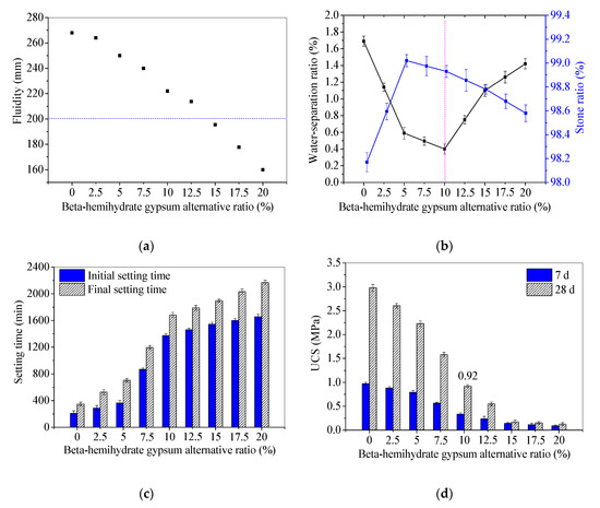 Additionally, the setting times are decreasing with the increasing BHG alternative ratio (Figure 3c). The prepared paste with 10% BHG alternative ratios possesses the initial setting time of 1375 min (more than 12 h) and the final setting time of 1683 min (less than 36 h), which satisfies the performance requirement of goaf grouting well [24].