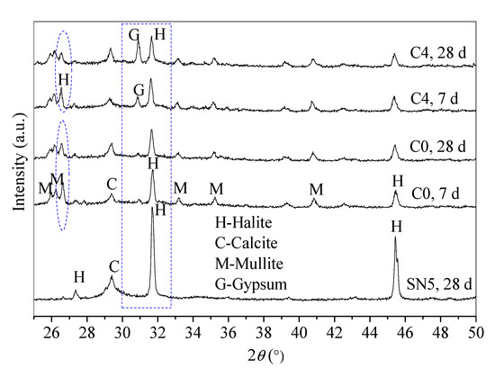 According to the reaction processes of SR-FFA-NS system paste, amorphous C-S-H gels in SR-NS system paste are produced from the reaction of SR and NS due to there being no detected diffraction peaks of C–S–H products [24]. Compared with XRD patterns of FFA and SR (Figure 1), there is the coexistence of C–S–H gels and (N,C)–A–S–H gels in SR-FFA-NS system paste at 28 d-age, both of which are amorphous. Thereafter, 10% BHG as alternatives are added into SR-FFA-NS system paste, which shows little difference in amorphous gel products at 28 d, and but the crystallinities of gypsum crystals distinctly increase due to higher peak intensity at approximate 31° 2θ. Moreover, the crystallinities of halite crystals decrease at 31~32° 2θ and 26~27° 2θ, which is attributed to more Na+ consumptions in the formation of (N,C)-A-S-H gels. Mostly, there is a distinct change in the diffraction peak intensity of gypsum and halite crystals as the curing age from 7 d to 28 d due to the gradual hydration of BHG. However, there are no ettringite crystals detected in control C0 and paste C4, which may result from the dissolved aluminum oxide tetrahedron from FFA preferring to produce the aluminosilicate gels but ettringites at early term. Here, the lack of ettringite peaks is also consistent with previous studies [36]. This may because that the ettringite is destabilized in the presence of Cl− ions [36].