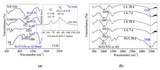 (a) Fourier transform infrared (FTIR) spectra of FFA, SR, control S100NS and paste S2F3NS at 180 d, and 29Si NMR spectrum of paste S2F3NS at 180 d from reference [24]. (b) Chemical bonds analysis of control C0 (SR-FFA-NS system) and paste C4 (SR-FFA-BHG-NS system) at 7 d and 28 d through FTIR spectra.
