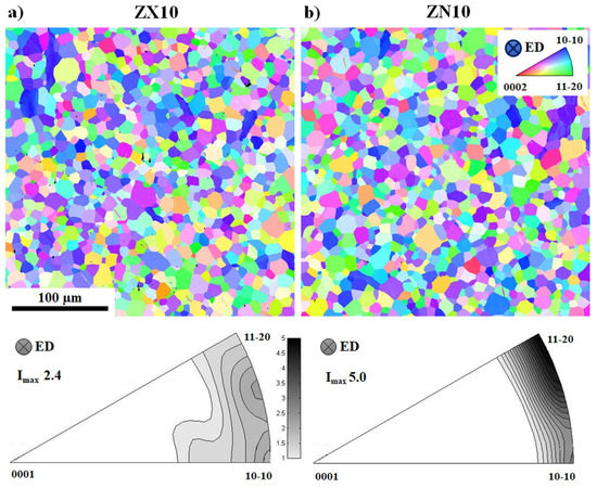 Microstructure and texture of (a) ZX10 and (b) ZN10 alloys. ED is perpendicular to the image plane of orientation maps and texture triangles.