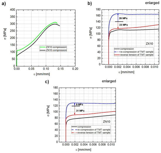 Engineering stress vs. plastic strain dependence for alloys in an as-extruded state (a) and in the thermo-mechanically treated (TMT) state: (b) ZX10-pre-compression up to 140 MPa (3% of strain) and isothermal aging at 150 °C for 16 h; (c) ZN10-pre-compression up to 120 MPa (3% of strain) and isothermal aging at 150 °C for 48 h. Please note that subfigures (b,c) represent the enlarged region of yielding. Black line in (b,c) refers to the pre-compression level for each alloy.