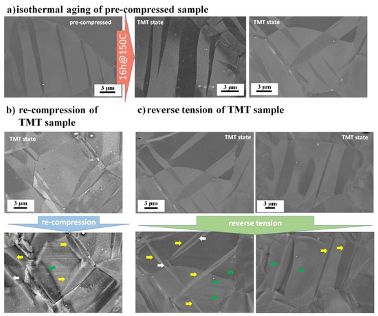 Backscattered electron (BSE) images of the ZX10 alloy: (a) with respect to the isothermal aging to achieve TMT state (pre-compression up to 140 MPa and subsequent isothermal aging at 150 °C for 16 h); followed by (b) re-compression up to 3% of strain or (c) reverse tension up to 2% of strain. ED is horizontal. Colored arrows highlight: yellow-immobile twin boundaries (TB); green–mobile TB; white–newly nucleated twins, accordingly.