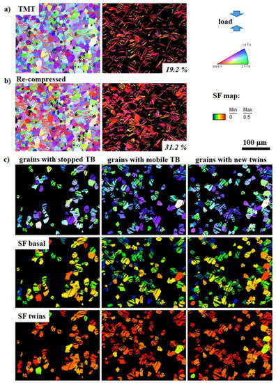 To obtain more information about the nature of twin behavior (nucleation of twins and TB mobility for its growth or shrinkage), the Schmid Factor (SF) values for the activation of basal slip and extension twinning have been estimated for each group of grains. For instance, the SF analysis for the TMT sample of ZX10 alloy subjected to re-compression is summarized in Figure 5c, lines labeled “SF basal” and “SF twin”. For all three grain groups, SF values for basal slip are comparable (in color scale in Figure 5c), as well as in the case of SF for twinning. Thus, the SF analysis does not reveal significant preferences for the activation of new twins or (im)mobility of existing TB in the analyzed groups. (SF analysis for reverse tensioned ZX10 and ZN10 samples, and re-compressed ZN10 samples are not presented in the manuscript.) No significant difference is observed with respect to the alloying content: SF values are comparable within different grain groups for both alloys, ZX10 and ZN10. The only general tendency that persists for all grain groups is the following: the SF values for twinning activity are higher for all sample states compared to those for a basal slip (see e.g., line “SF twin” vs. line “SF basal” in Figure 5c).