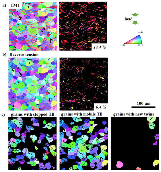 Following the initial TMT condition, the respective orientation maps after re-compression or reversed tension are shown in Figure 5b, Figure 6b, Figure 7b and Figure 8b, respectively. It becomes generally clear that re-compression leads to an increase of the TVF (ZX10: 31%, ZN10: 37%), but to a decrease after reversed tension (ZX10: 6%, ZN10: 13%). A detailed analysis of the maps reveals that during the following loading of the samples in the specified TMT state, there are few scenarios for the TB mobility. Therefore, the grains were separated into three groups: with stopped (at least one of TB is immobile) or mobile TB (including partly or completely vanished TB in case of reverse loading) and with newly activated twins. In both investigated alloys, there are immobile and mobile TB as well as newly activated twins. Orientation maps (first lines in Figure 5c, Figure 6c, Figure 7c, and Figure 8c) indicate that (im)mobile TB and the nucleation of new twins are rather independent on the orientation of the parent grains. Stopped TB are observed in both alloys after re-compression or reverse tension of sample in the TMT condition (grains with stopped TB in Figure 5c, Figure 6c, Figure 7c and Figure 8c). Therefore, as a result of intermediate isothermal aging, a number of TB remain immobile for both subsequent loading: re-compression or reverse tension. In general, the suppression of the TB mobility is independent on the loading direction. Besides immobile TB, some TB maintain their mobility for both forward and backward movement (grains with mobile TB in Figure 5c, Figure 6c, Figure 7c and Figure 8c). Moreover, the nucleation of new twins is observed to be independent on the loading mode in both the ZX10 and ZN10 alloys (grains with new twins in Figure 5c, Figure 6c, Figure 7c and Figure 8c). Naturally, there are newly activated twins during re-compression. However, during reverse tensile loading, despite the unfavorable lattice orientation for extension twinning (c-axis is perpendicular to tensile loading), some new twins are nucleated as well.