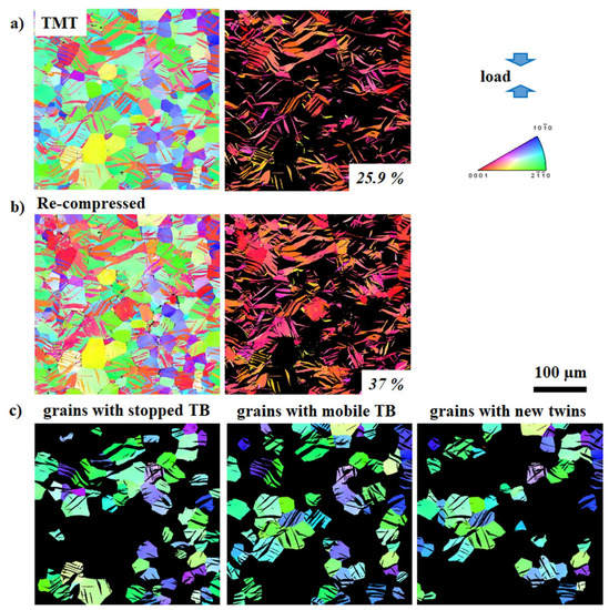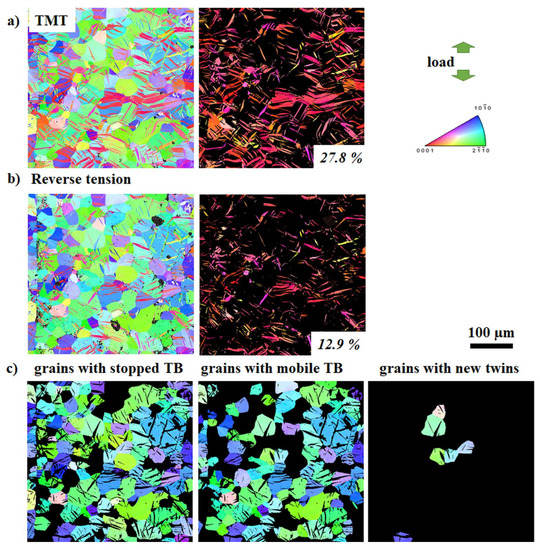 To evaluate the influence of twinning and detwinning impedance on the mechanical properties, the twin volume fraction (TVF) increment or decrement as a result of further loading of samples in TMT state can be used as a representative numerical parameter. It is based on the idea that twin growth or shrinkage (resulting in a certain increment or decrement of TVF) depends on the ability of TB to move. The nucleated extension {10-12} twins provide plastic compatibility for deformation along the c-axis according to the von-Mises criteria. Therefore, the achieved TVF is strongly related to the mechanical behavior of the material. The development of the TVF during re-compression or reverse tension of the ZX10 and ZN10 alloys after TMT are depicted in Figure 5, Figure 6, Figure 7 and Figure 8 (as a representative part of the microstructure). Maps containing only twins are presented separately for better visualization of the twin size and the TVF increment or decrement. The variation in the TVF values is included in the evaluation error. Moreover, the analysis of orientation maps provides information about the effect of parent grain orientation on further growth, shrinkage or “no change” of twins. Thus, the position of TB before and after loading was analyzed for each grain in the obtained orientation maps in order to reveal if those TB are either mobile or not with respect to the orientation of the parent grain.