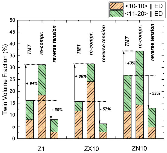 Twin volume fraction (TVF) for grains with their <10-10> or <11-20> axis parallel to the loading axis in the TMT state of ZX10, ZN10, and Z1 [49] alloys. The evaluation error of TVF values for each sample is about 4%.