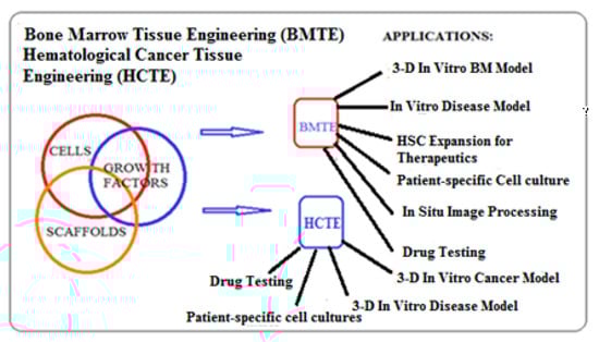 Most of the research on cancer was focused on solid cancer tumors, as such now there is a greater opportunity to focus on HCs. The potential of MSC to increase proliferation and maintenance of hematopoietic progenitor cells is harnessed in co-cultures with the HSC to enhanced engraftment of HSC in transplantation [], formation of micro blood vessels with endothelial cells [], multi-lineage hematopoiesis in co-cultures with differentiated osteoblasts [] can be further exploited in 3-D co-cultures modeling the niche components in vitro using advanced scaffold systems. The role of macrophages in maintaining hematopoiesis [,] can be further assessed. HSC niche mimetic 3-D scaffolds may be used to study the role of cytokines and application in an in vitro model for testing myeloid toxicity. As HC cells flourish in the BM microenvironment and are resistant to cytotoxic drugs, BM and HC mimetic 3-D scaffolds help in understanding the drug efficacy and toxicity studies in vitro with in vivo conditions. The study of primary cells from AML, HUVCE and MSC to mimic cell interactions between AML and the vascular niche assists in visualization of AML-vascular interactions in chemotherapeutic responses. The MSC model of the multiple myeloma (MM) BM niche indicates cytokine secretion by MSC in 3-D cultures supporting MM cell growth. The various scaffold types used for different applications in BMTE and HCTE are summarized in Figure 6.