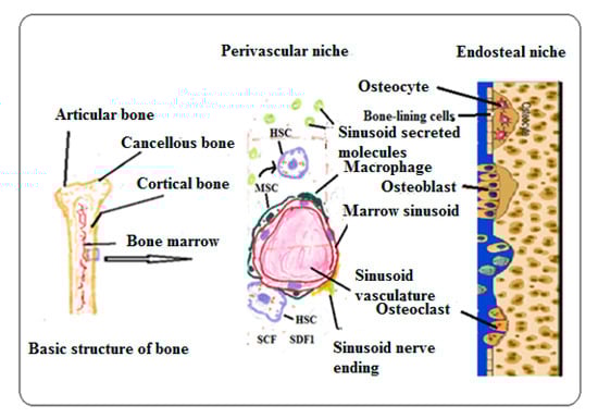 The bone consists of cortical bone, cancellous bone, the periosteum, the endosteum, and articular cartilage (Figure 3). The cortical bone exhibits hierarchical structural organization with osteon, Haversian canals lamella, collagen fibers, collagen fibrils, and non-collagens molecules that are in association with the collagen molecules [,]. It is divided into three regions, namely the endosteum, central marrow, and periosteal regions on the basis of the cell types and surrounding structural composition. The multipotent MSCs, bone-lining cells (BLC), osteoblasts, osteocytes, macrophages, and osteoclasts are involved in BM maintenance and remodeling in endosteum. The central marrow is composed of HSCs and progenitor cells (HSPC). These cells are embedded in a meshwork of structural proteins constituting the soft extracellular matrix (ECM). It provides structure and a biochemical platform for HSPC cells to interact and function [,,,]. The perivascular niche is highly vascularized fibrous connective tissue. It is a site of homing for mesenchymal cells, where they differentiate into various cell types such as adipocytes, osteocytes, chondrocytes, and endothelial and neuronal cells [].