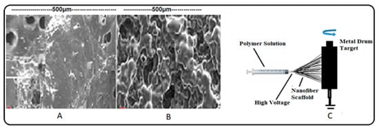 3-D scaffolds. (A) Pores in the PLGA scaffold generated using the gas foaming method; (B) Pores in the PLGA scaffold generated using solvent casting and particulate leaching method; (C) Schematic of electrospinning of desired polymer solution and deposition of solid fibers on the target collector. The liquid polymer transforms into solid fibers because of the effect of high voltage [,].