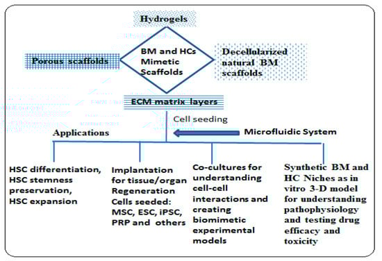 In tissue engineering, culture-expanded cells and scaffolds are used to produce a tissue construct for implantation. They support tissue regeneration and growth, but not as a prosthesis. In bone disorders, because of disease, irradiation, and chemotherapy, the bone environment is damaged. As a repairing strategy, scaffolds were seeded with MSCs, embryonic stem cells (ESCs), adult stem cells, induced pluripotent stem cells (iPSCs), and platelet-rich plasma (PRP) for recovering and repairing the damaged bone tissue []. Similarly, damaged central marrow and perivascular regions can be repaired using soft hydrogel-based scaffolds. MSCs grown on polycaprolactone (PCL) fibrous scaffolds produced paracrine products involved in tissue repair/regeneration []. An advanced method of biomimetic engineered bone marrow (eBM) is a “bone marrow-on-a-chip” microfluidic system. It involves culturing the cells on a scaffold in vitro, implantation in vivo, removal, and perfusion with media in microfluidic devices. It was demonstrated to have HSC and progenitor cell characteristics [,]. The MSC and cord blood derived HSPC cultured on hydroxyapatite coated zirconium oxide scaffold showed that HSPC remained in their primitive state (CD34+ CD38−) and were capable of forming all major colonies [].