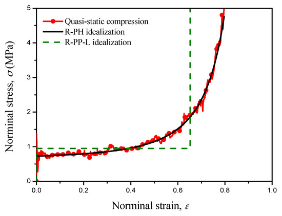 Due to the difficulty of obtaining the dynamic stress-strain relations of cellular materials, the quasi-static stress–strain curve is often used to evaluate and design the cellular cladding for engineering projects. The stress-strain curve of cellular materials under quasi-static compression presents three distinct regions, namely an elastic region, a long plateau plastic region and a densification region. Several simplified idealizations were therefore proposed to characterize the collapse behavior of cellular materials. The R-PP-L idealization [7,8] is the most popular one, and it only contains two material parameters, i.e., plateau stress and locking strain. However, it is demonstrated that the R-PP-L idealization can only provide a first-order approximation for the deformation behavior of cellular materials owing to the constant locking strain assumption [2]. The densification region of the quasi-static stress-strain curve presents a strongly nonlinear plastic hardening phenomenon [12,37], which may be more directly reveal the unreasonableness of the R-PP-L idealization for cellular materials. Here, the rate-independent R-PH idealization proposed by Zheng [12] is implemented to characterize and predict the energy absorption of cellular materials, as shown in Figure 2. The R-PH idealization can depict the stress-strain curves well, and it can be given by