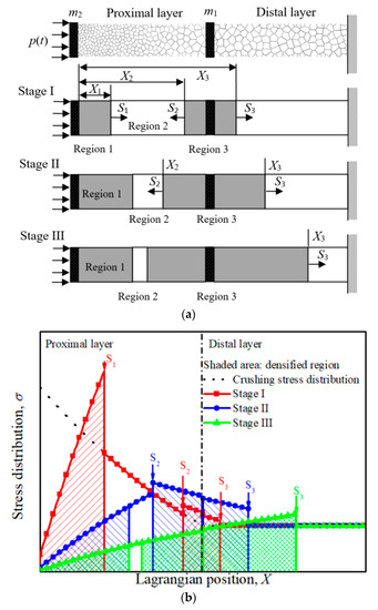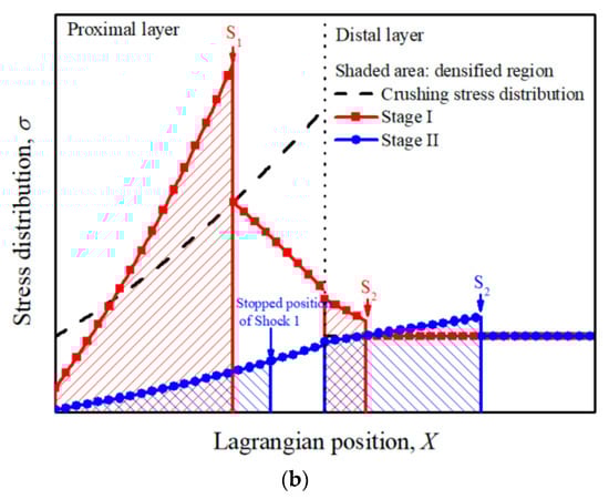 The deformation at Stage II is governed by Equations (12) and (13), and the initial conditions are X1 = x11, X2 = x12, v1 = v2 = v11 = v12, where x11, x12, v11 and v12 are the Lagrangian coordinates of Shocks 1 and 2, the velocities of Regions 1 and 2 at the end of Stage I, respectively. The typical stress distribution along the cladding at Stage I and II are depicted in Figure 3b. It is obvious that the stresses at the undeformed regions do not exceed the local initial crushing stress, which illustrates that the assumption of double shock waves is self-consistent.