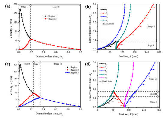 (a) Time histories of Region velocities and (b) the position of shock fronts for PG-U cladding (γ = 2/3, L2 = 91.6 mm and L = 272 mm); (c) time histories of Region velocities and (d) the position of shock fronts for NG-U cladding (γ = −2/3, L2 = 140 mm and L = 298 mm).