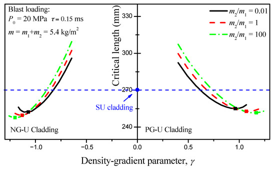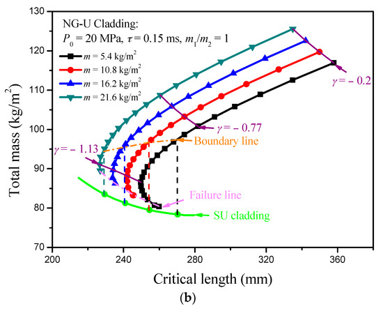 In fact, the blast loading can be treated as an impulse loading, so the mass per unit area of the cover plate indirectly decides the work done by the blast loading. Thus, a direct result can be deduced that the critical length of the sacrificial cladding decreases with increasing of the mass per unit area of cover plates, and it is verified by the numerical results, as shown in Figure 6. However, the total mass of the cladding presents an opposite law with the variation of the mass of cover plate. Under a fixed cover plate mass m, the critical length of PG-U cladding decreases first and then increases until it reaches the critical length value of SU cladding with the increasing of density-gradient parameter γ. At the same time, the total mass of PG-U cladding always shows a downward trend until it reaches the boundary of SU cladding. Therefore, the SU cladding is an excellent choice for the mass design indicator. In contrast, the PG-U cladding is more advantageous when choosing a large γ from the perspective of the critical length design indicator. There is a region in the total mass-critical length figure characterizing PG-U cladding should be preferred compared with SU cladding in critical length design. Two lines surround this region: one is indicated by SU cladding, the other is the boundary line where the critical length of PG-U cladding is equal to that of SU cladding. Similar results can be found for NG-U cladding. However, its variation curves of total mass and critical length cannot reach to the boundary of SU cladding with increasing of |γ|, and they are interrupted by the failure line which is determined by (P0 − σ(ρ(0)))/m2 = −4γk1σSρ0/(2+γ)L2ρS2 as mentioned in Section 3.2. In general, P0 is larger than σ0(0), but this condition will be met when |γ| is large. Therefore, the advantageous region for NG-U cladding is surrounded by the boundary line and the failure line, as shown in Figure 7.