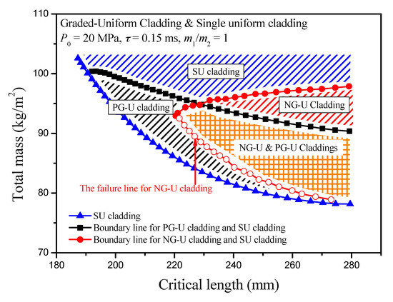 Thus, partition diagrams in the total mass-critical length figure can be obtained when the minimum length of cladding is the design goal, where the blue, black and red shaded areas represent SU cladding, PG-U cladding and NG-U cladding, respectively, while the orange shaded area is the dual area for PG-U and NG-U claddings. Those shaded areas are distinguished by the lines representing SU cladding, the failure line for NG-U cladding, and two boundary lines as mentioned above. It is evident that SU, PG-U and NG-U claddings occupy different regions in the total mass-critical length figure, as shown in Figure 8, and it should identify different sacrificial claddings according to the actual demand. However, the SU cladding is a superior one compared with the PG-U and NG-U claddings, when total mass is the pursuit of goals.