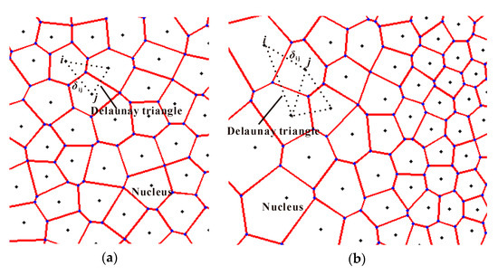2D irregular honeycombs with a uniform cell-wall thickness are used and generated by utilizing the 2D Voronoi technique [45] in this study. The methodology of the Voronoi technique can generally be described in four main stages [22,46]. At first, N nuclei were randomly scattered in a given region. Secondly, the nuclei were imaged to the surrounding regions to make sure the boundary density is consistent with the preconcerted design. Thirdly, Delaunay triangulation is constructed, and then the Voronoi diagram is determined. Finally, the part of the Voronoi diagram of the given region is reserved for further analysis. It is reported that 2D graded cellular structures can be realized by switching the nuclei scatter strategy in the first Stage [22], as shown in Figure 9. The distance between any two nuclei i and j is required to be