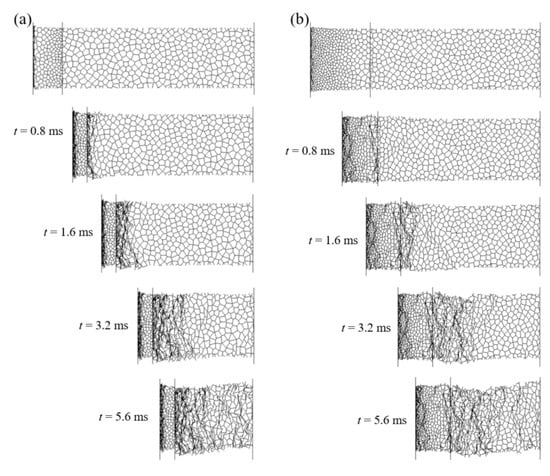 Detailed deformation patterns of PG-U cladding and NG-U cladding under blast loading of P0 = 30 MPa and τ = 0.15 ms are shown in Figure 11a,b, respectively. It can be observed that two shock fronts initiate simultaneously in PG-U cladding once the blast loads, and three shock fronts commence simultaneously in NG-U cladding. Those phenomena are consistent with the assumptions of theoretical analysis. However, the crushing behavior presents random deformation bands at the later stage of compression for both claddings, because of the decrease of impact velocity. As the velocity of the attached mass becomes low at the later stage of compression, see Figure 10a,c, the deformation mode of the cellular sacrificial cladding changes into a transition or homogeneous mode [12,15,37,45], which can be verified by the random shear collapse bands in the uniform cellular layer. Thus, the results will be more accurate for cellular sacrificial cladding when considering both dynamic and quasi constitutive relations.