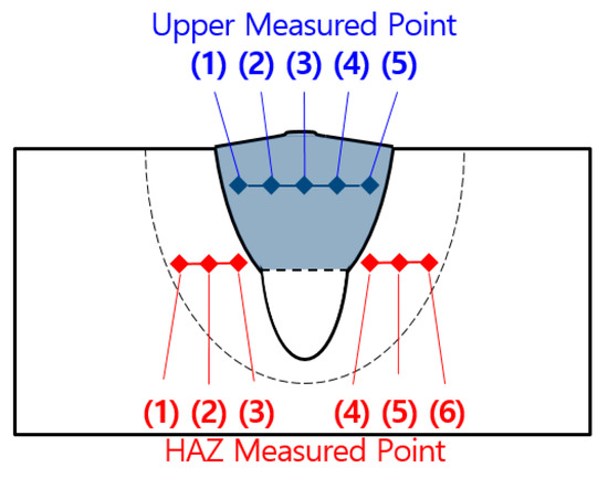 Since the fiber laser welding process used in this experiment performs welding while generating keyholes by transmitting high energy required for welding to the material surface, laser power, defocusing, and welding speed were selected as input parameters and the weldability was analyzed by collecting output parameters such as penetration shape and hardness, etc. [11]. Figure 3 shows a schematic diagram to measure the penetration shape of a welding part [17].