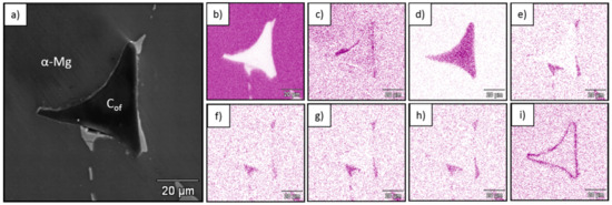 Figure 2, Figure 3 and Figure 4 show SEM and EDS images from the obtained composites which revealed continuous bonding between foams and matrices and confirmed well-known structural effects typical for C–Mg systems that depend on matrix composition. The oxygen concentration increased at the foam–metal interface due to the formation of oxide type bonding (Figure 2c, Figure 3c and Figure 4c) [45]. Additionally, the aluminum concentration increased in that region for AZ31, as a result of Mg17Al12 phase accumulation, oxide phases and Al4C3 carbide formation. In the case of the RZ5 matrix, except for the magnesium oxide layer enriched with RE (rare earth elements) (Figure 4f–h) the accumulation of Zr (Figure 4i) was observed at the interface, as well as irregular intermetallic phases of RE and Zn (Figure 4g,h).