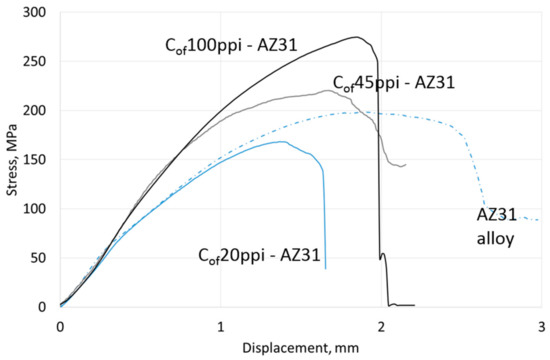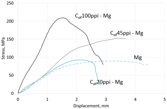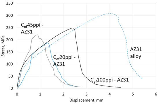 Compressive strength results are shown in Table 4, representative curves for materials with different cell size foams and pure Mg, AZ31 and RZ5 matrices are shown in Figure 6, Figure 7 and Figure 8, respectively. They showed a strength increase for all composites with pure Mg matrices, but more intense as the foam cell size decreases. For the AZ31 matrix, the compression strength also increased as the cell sizes changed and were higher than the reference matrix alloy when 45 ppi and 100 ppi foams were used. For the RZ5 composite, only the Cof45ppi foam showed a strength increase. In general, increases in maximal stress with cell size as well as curve angle increases at the elastic deformation region were revealed; both of which were independent of matrix composition. These results showed the role of carbon foam produced components with higher strengths and varying geometries, and matrix microstructure refining due to crystallization changes.