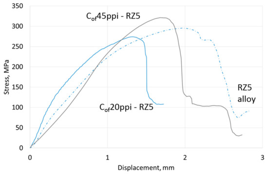 Results of three-point bending tests are presented in Table 4; representative curves for materials with different cell size foams and pure Mg, AZ31 and RZ5 matrices are shown in Figure 12, Figure 13 and Figure 14, respectively. They revealed that the bending strength (maximal stress) of composites was always lower than the reference metallic matrix material and is explained by the limited deformation of magnesium due to packed carbon foams cells. The second difference was an increase of the stress vs. displacement curve angle in a region of elastic deformation; that confirmed a stiffness increase induced by the carbon foam which was also observed during compression tests. In addition, a dependence of maximal stress on foam cell size and matrix composition was observed. The bending strength increased as the cell size decreased and increased Mg → AZ31 → RZ5 for composites with the same cell size (Table 4).