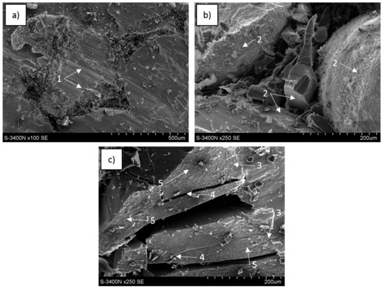 SEM images of Cof45ppi–AZ31 composite fractured during compression strength testing: (a) metal areas with shear bands (1) surrounded with degraded cells of carbon foam, (b) particles of refined carbon foam and metal surface after delamination from the foam, both locally coated with a layer of fine phases (2), (c) glassy carbon bonded with matrix (3), fragmented by microcracking (4) and locally (5) coated with fine phases formed in contact with liquid matrix and after crystallization.