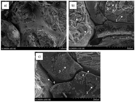 SEM images of the fractured surfaces from a central region of the sample formed during three-point bending tests are presented in Figure 15, Figure 16 and Figure 17. They revealed similar effects observed during compression tests as well as a few new effects. All reference matrix material samples were also deformed without fracture formation.