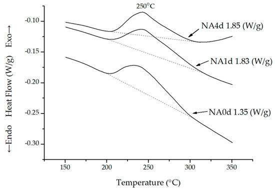 An enlarged view of the DSC traces for the experimental alloys in the range of 150 °C to 350 °C is presented in Figure 1. The exothermic peak at 250 °C represents the precipitation of θ’ and Ω strengthening phase [24]. The enthalpy changes of the NA0d, NA1d, and NA4d alloys were 1.35, 1.83, and 1.85 W/g, respectively, showing that natural aging could significantly increase the exothermic heating. However, there was no obvious increase in exothermic heat while the increased period of natural aging time from 24 h to 96 h.