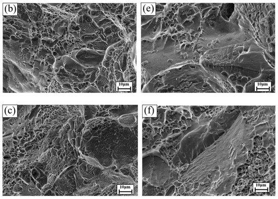 Fracture surface of A201-T7 alloys after slow strain rate testing: (a) NA0d sample in air; (b) NA1d sample in air; (c) NA4d sample in air; (d) NA0d sample in salt water; (e) NA1d sample in salt water; (f) NA4d sample in salt water.