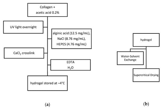 Synthesis process: (a) Synthesis of collagen–alginate hydrogel; (b) synthesis of aerogel (EDTA-ethylenediaminetetraacetic acid, HEPES-4-(2-hydroxyethyl)-1-piperazineethanesulfonic acid).