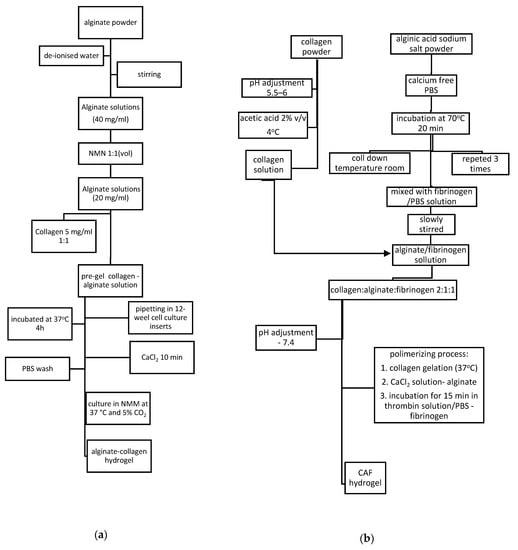 Other synthesis route for alginate–collagen hydrogel is presented in Figure 5b. CAF hydrogels presented pore sizes between 40 and 120 μm also exhibited improved mechanical and elastic properties and cytocompatibility for three cell lines: L929; hMSCs and MIN6 β-cells, with a microenvironment that supports cell survival and function for cell culture applications [45].