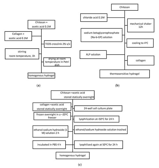 Synthesis route of: (a) Collagen–chitosan using pre-gel solution 10 mg/mL alginate and 2.5 mg/mL collagen. (b) Collagen–chitosan thermosensitive hydrogel. (c) Collagen–chitosan homogenous hydrogel for nerve tissue regeneration.