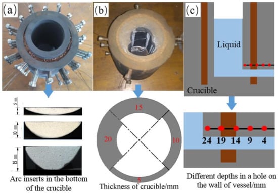 The three scenarios of the laboratory vessel used to simulate the erosions of hearth wear are presented in Figure 2. Figure 2a illustrates three arcs with different heights (5, 10, and 15 mm) made by the aluminum oxide. The arcs were inserted and fixed along the inner wall at the bottom of the vessel before the experiments were performed. Another new vessel had four thicknesses (5, 10, 15, and 20 mm) at different points along the circumference, which can be seen in Figure 2b. EMF sensors were fixed at five depths (24, 19, 14, 9, and 4 mm) in a hole on the wall of the vessel as shown in Figure 2c, and they were used to measure the effect of EMF signals on the thickness of the wall.
