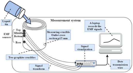 At the beginning of the experiments, around 5 kg of liquid tin was dumped into the apparatus from the entrance as shown in Figure 1. Then, the tin flowed out with the gravitational force from the exit at the bottom of the vessel. During the drainage of the liquid metal, the measurement system shown in Figure 3 includes the EMF sensors, the signal transform, the signal visualization, and a laptop that recorded the EMF signals.