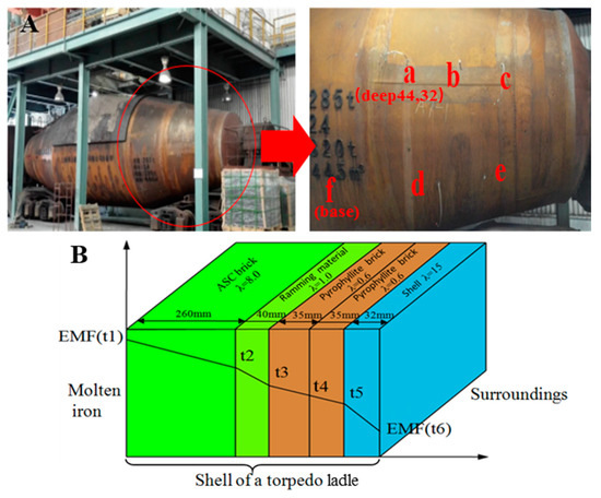 EMF experiments and sensor locations in the shell of a 285 t torpedo ladle: (A) EMF locations of a, b, c, d, e, and f on the shell and (B) properties of each refractory layer from Al2O3-SiC-C (ASC) brick to steel shell).