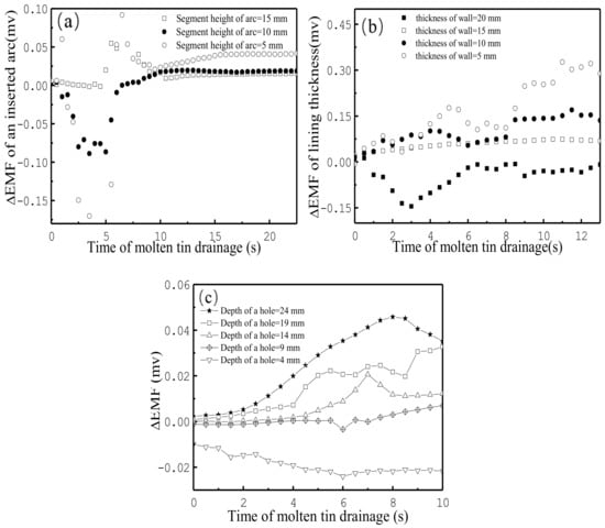 The third way to study the relationship between the thickness of the refractory material and the EMF signal was to use the EMF sensors that were fixed at five depths (24, 19, 14, 9, and 4 mm) in a hole on the wall of the vessel. These results are presented in Figure 8c, where the X-axis (time of molten tin drainage) = 0 and the end of the X-axis indicates the start and end of the drainage in the vessel. The EMF signals increased with an increase in the depth of the hole, and the difference in EMF signals was almost equal, especially in the interval of 0 to 6 s shown in Figure 8c. The above indicates EMF signals had a positive relationship with the thickness of the refractory wall.