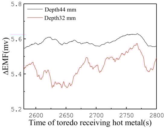 Torpedo ladle measurement experiments were conducted under the casting house of a blast furnace in Baosteel. Figure 9 shows the EMF signals collected from the “a” location during a time period. The EMF signals were collected with the aforementioned receiving procedure of the liquid metal, which showed an increasing tendency over time. Furthermore, EMF at a depth of 44 mm is greater than at a depth of 32 mm, which is consistent with the results obtained from the laboratory vessel.
