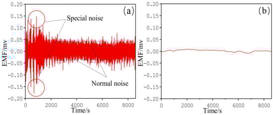 In order to further study EMF monitoring technology, a 3-day monitoring experiment was carried out on a newly constructed blast furnace. EMF signals on the blast furnace included the basic, the periodic, and the noise part [27]. The noise should be removed. When the blast furnace operation was stable, the EMF value fluctuated in a period, as shown in the normal noise in Figure 10a. Moreover, when there were disturbances, the amplitude of the EMF signal decreased, which can be seen by the special noise shown in Figure 10a. The removal method of the noise signals is further explained in our previous work [28].