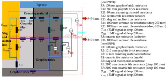 The thickness of the hearth wall can be seen in Table 2. According to the installation points of the EMF sensors and the structure of the blast furnace, the EMF measurement principle [29,30,31] of the blast furnace is drawn in Figure 11 and the equivalent circuit of EMF signals is illustrated in Figure 12. The EMF signal gradually decreased with increasing tapping time. During the tapping gap, the EMF signal strengthened as the liquid iron level in the hearth increased. The absolute value of EMF at 200 mm depth was greater than at 100 mm depth at 8494 and 9494 levels, indicating that EMF increased with the decrease in the refractory thickness. More details of the studies on the effects of liquid levels with EMF can be found in our previous work [28].