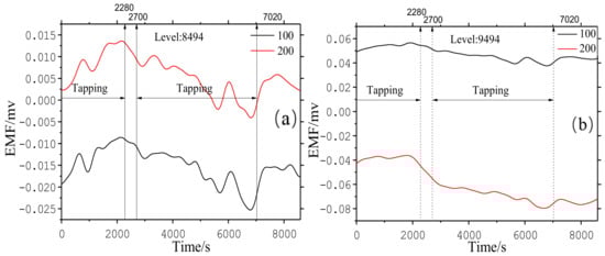 EMF signals of blast furnace hearths: (a) EMF signals on the “2” direction at the 8494 level and (b) EMF signal on the “2” direction (C.F. Figure 7) at the 9494 level.